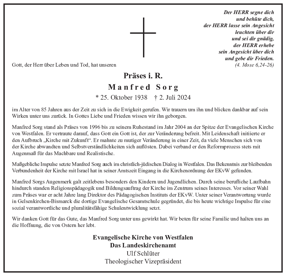 Präses i. R. Manfred Sorg, Altpräses der Ev. Kirche von Westfalen, am 2. Juli 2024 im Alter von 85 Jahren.
