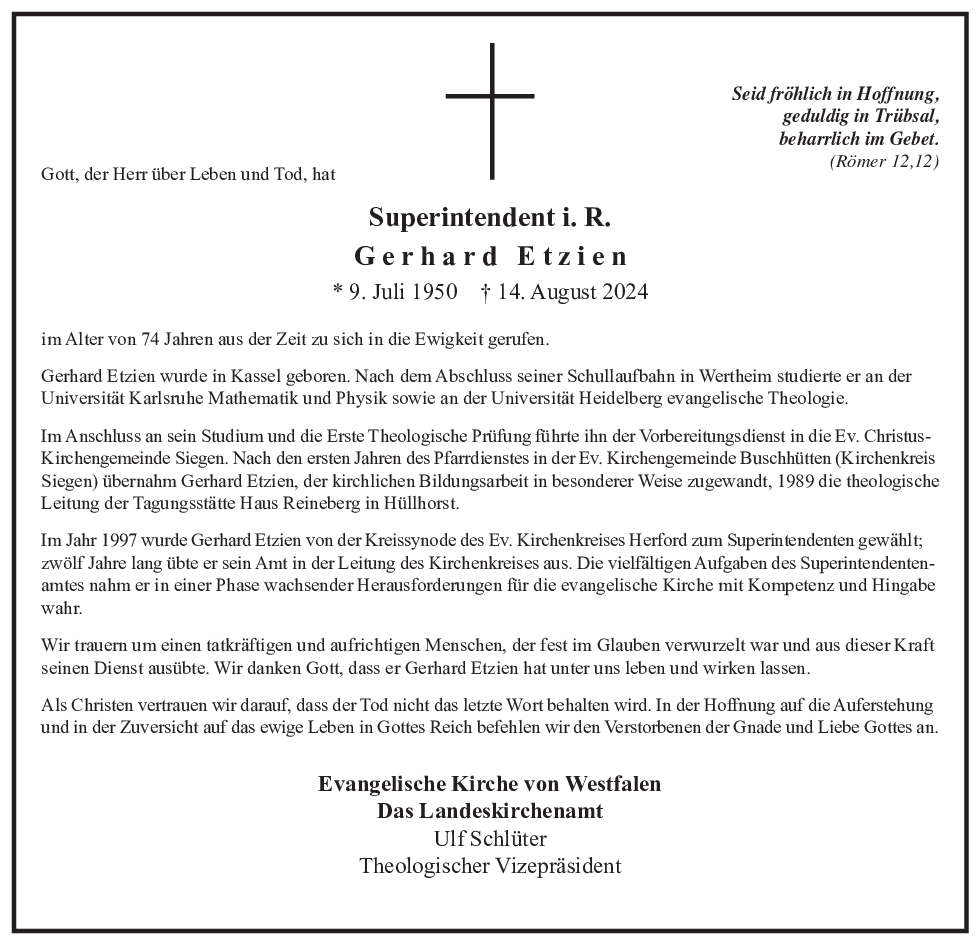 Superintendent i. R. Gerhard Etzien, zuletzt Superintendent des Ev. Kirchenkreises Herford, am 14. August 2024 im Alter von 74 Jahren,